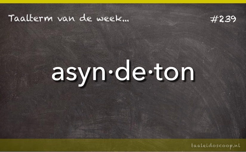 De taalterm van deze week, asyndeton, is er eentje van de categorie: geen grammetje te veel. Waarom zou je bezwaard willen zijn met extra ballast als je ook zonder kunt? Sterker nog, een beetje slank is wel zo aantrekkelijk, vindt hij zelf.